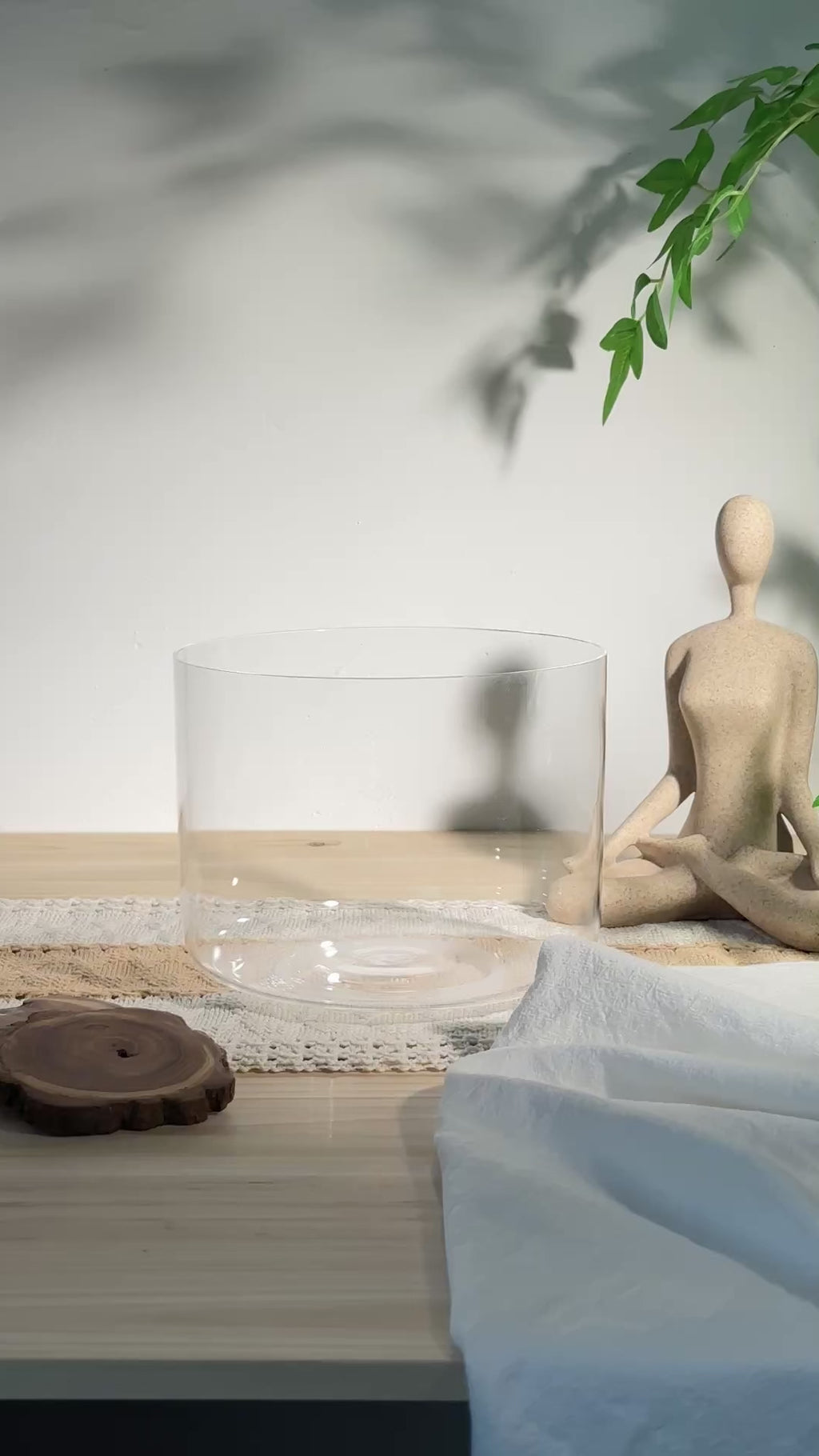 The Prism Series perfect pitch, F#3 quartz crystal singing bowl at 7.75 inches in diameter -- 440hz tuning is used to measure.