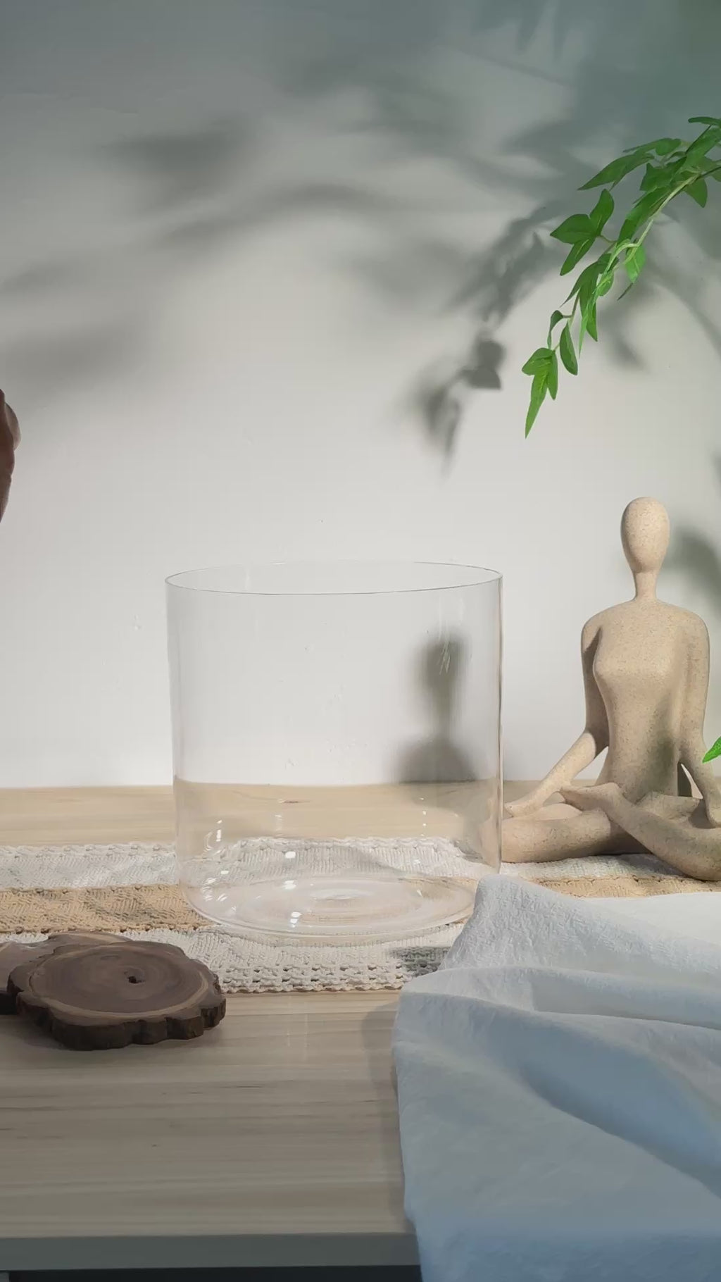 The Prism Series perfect pitch, G#3 quartz crystal singing bowl at 7.25 inches in diameter -- 440hz tuning is used to measure.