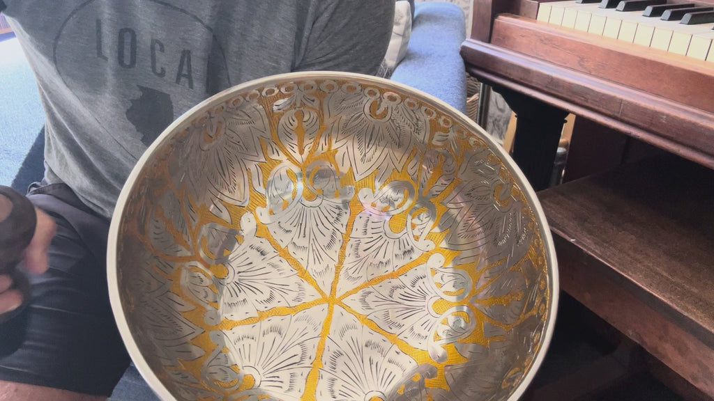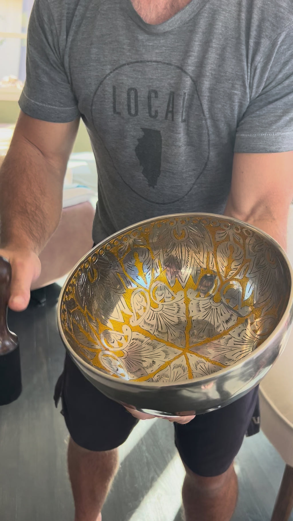 7.5 inches of bell-metal-bronze, hand-engraved and gold-gilded bronze singing bowl. Selected from hundreds for the characteristic Ohm Sound.