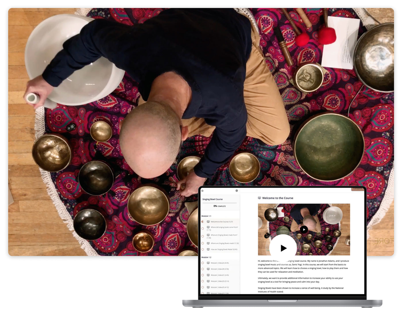 A set of heirloom quality bronze singing bowls and an educational video course that walks you through how to use and benefit from your new, specialty instruments.